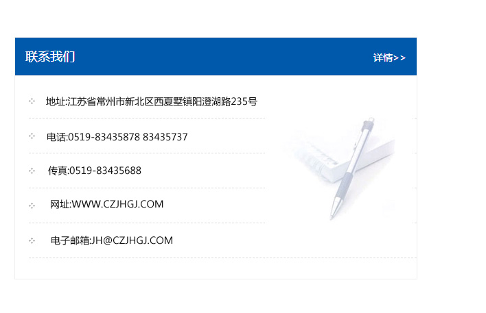 地址:常州市新北區友邦商務大廈1幢16、17層  電話:0519-85101652  傳真:0519-85112595  郵編:213022  網址:www.cz-jiayue_cn.gyldj.net  郵箱:xiajifengaa@163.com